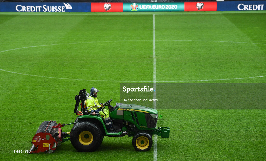 15 October 2019; A member of the Stade de Genève grounds staff prepares the pitch prior to the UEFA EURO2020 Qualifier match between Switzerland and Republic of Ireland in Geneva, Switzerland. Photo by Stephen McCarthy/Sportsfile