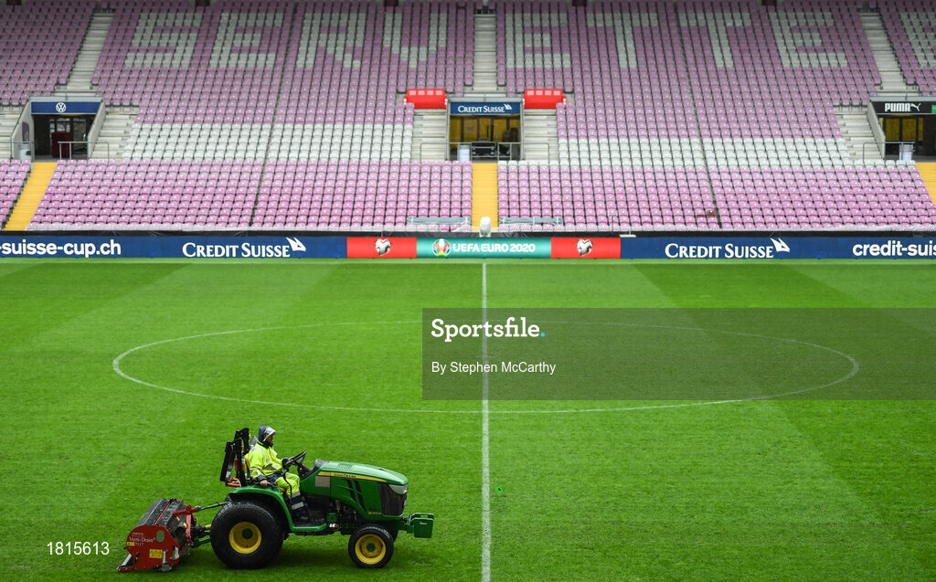 15 October 2019; A member of the Stade de Genève grounds staff prepares the pitch prior to the UEFA EURO2020 Qualifier match between Switzerland and Republic of Ireland in Geneva, Switzerland. Photo by Stephen McCarthy/Sportsfile