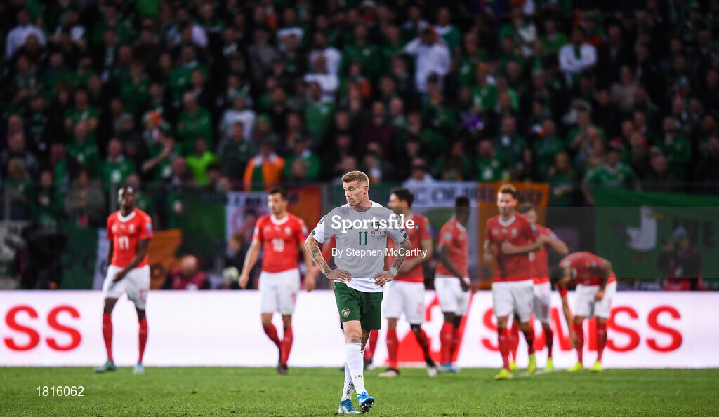 15 October 2019; James McClean of Republic of Ireland reacts after his side conceded their first goal during the UEFA EURO2020 Qualifier match between Switzerland and Republic of Ireland at Stade de Genève in Geneva, Switzerland. Photo by Stephen McCarthy/Sportsfile