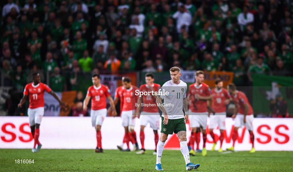 15 October 2019; James McClean of Republic of Ireland reacts after his side conceded their first goal during the UEFA EURO2020 Qualifier match between Switzerland and Republic of Ireland at Stade de Genève in Geneva, Switzerland. Photo by Stephen McCarthy/Sportsfile