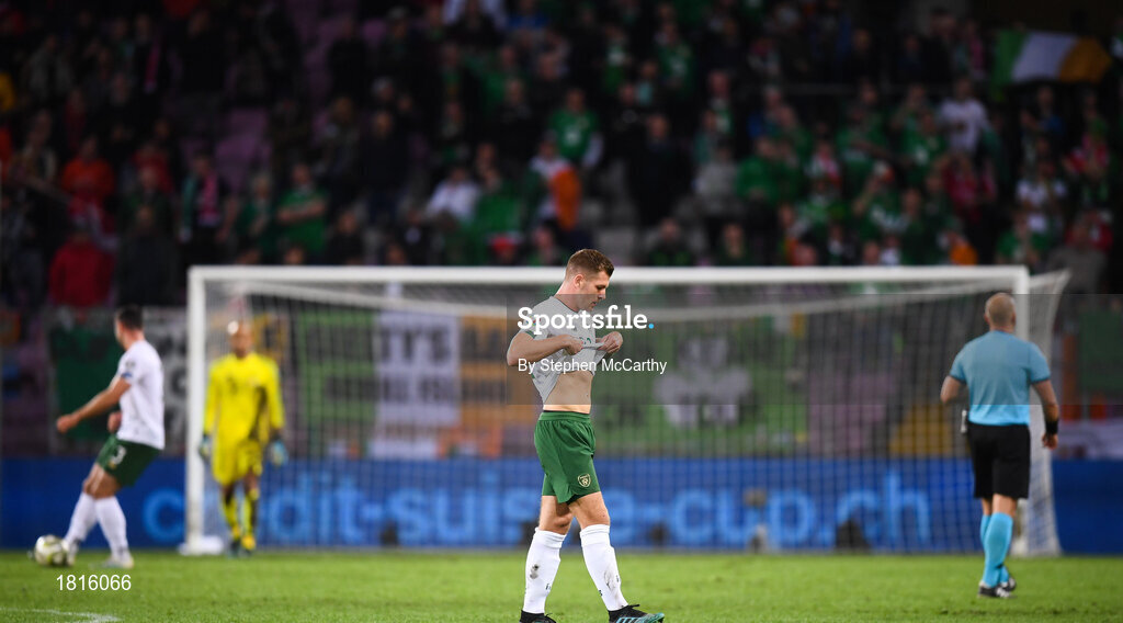 15 October 2019; James Collins of Republic of Ireland reacts after his side conceded their first goal during the UEFA EURO2020 Qualifier match between Switzerland and Republic of Ireland at Stade de Genève in Geneva, Switzerland. Photo by Stephen McCarthy/Sportsfile
