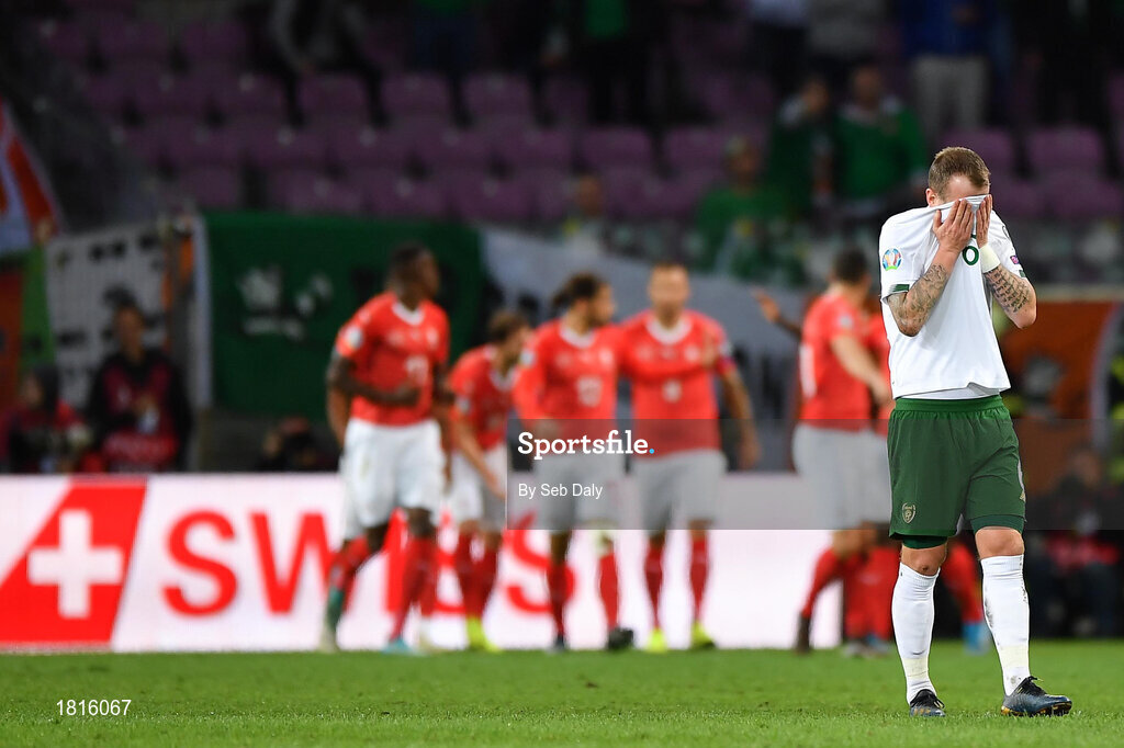 15 October 2019; Glenn Whelan of Republic of Ireland reacts after his side conceded a goal during the UEFA EURO2020 Qualifier match between Switzerland and Republic of Ireland at Stade de Genève in Geneva, Switzerland. Photo by Seb Daly/Sportsfile