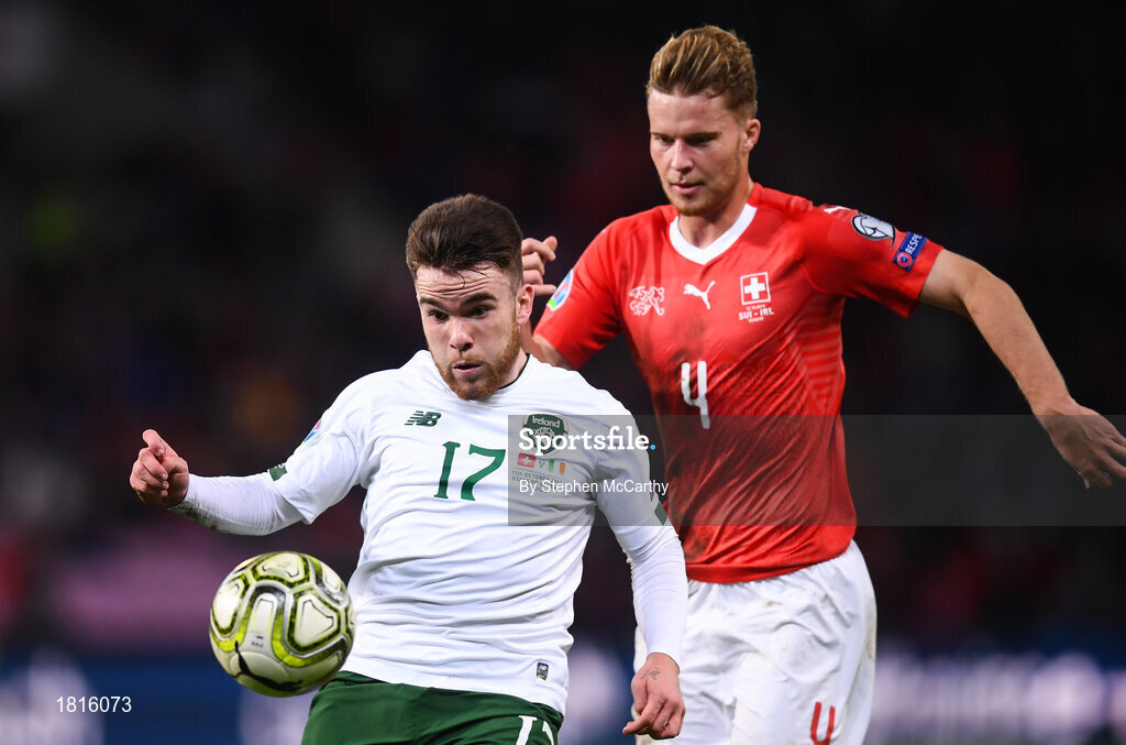 15 October 2019; Aaron Connolly of Republic of Ireland in action against Nico Elvedi of Switzerland during the UEFA EURO2020 Qualifier match between Switzerland and Republic of Ireland at Stade de Genève in Geneva, Switzerland. Photo by Stephen McCarthy/Sportsfile