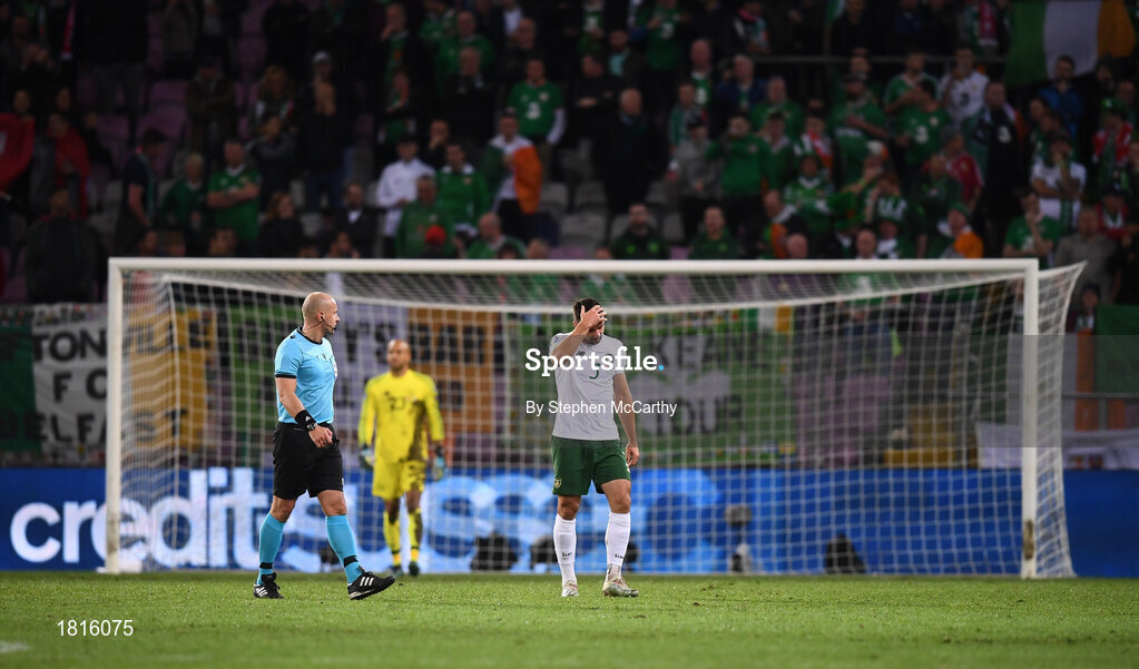 15 October 2019; Enda Stevens of Republic of Ireland reacts after his side conceded their first goal during the UEFA EURO2020 Qualifier match between Switzerland and Republic of Ireland at Stade de Genève in Geneva, Switzerland. Photo by Stephen McCarthy/Sportsfile