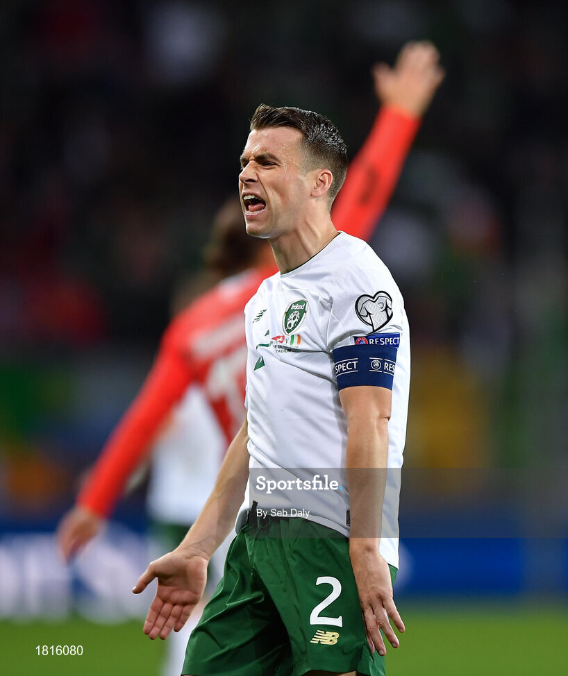 15 October 2019; Seamus Coleman of Republic of Ireland reacts after a foul is given against him during the UEFA EURO2020 Qualifier match between Switzerland and Republic of Ireland at Stade de Genève in Geneva, Switzerland. Photo by Seb Daly/Sportsfile
