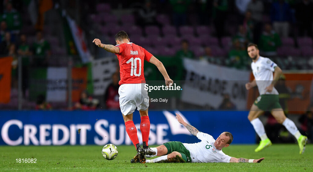 15 October 2019; Glenn Whelan of Republic of Ireland in action against Granit Xhaka of Switzerland during the UEFA EURO2020 Qualifier match between Switzerland and Republic of Ireland at Stade de Genève in Geneva, Switzerland. Photo by Seb Daly/Sportsfile