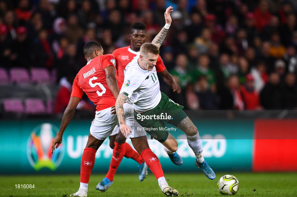 15 October 2019; James McClean of Republic of Ireland in action against Manuel Akanji of Switzerland during the UEFA EURO2020 Qualifier match between Switzerland and Republic of Ireland at Stade de Genève in Geneva, Switzerland. Photo by Stephen McCarthy/Sportsfile