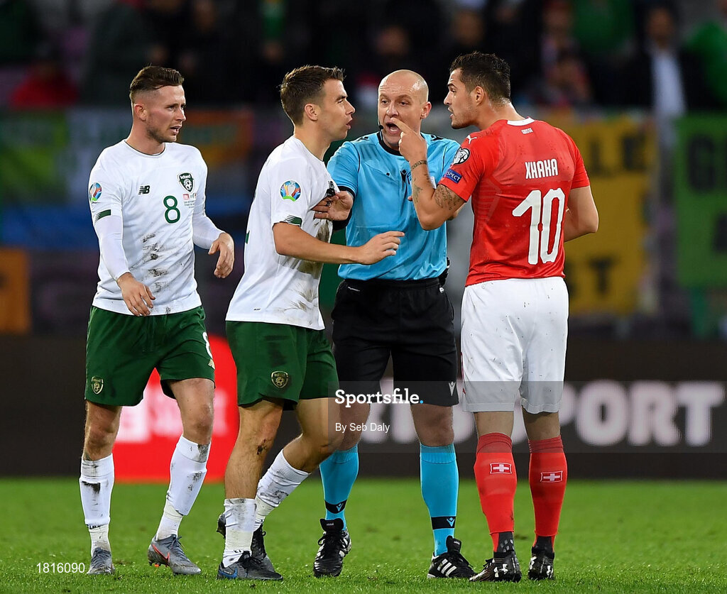 15 October 2019; Referee Szymon Marciniak attempts to separate Seamus Coleman of Republic of Ireland and Granit Xhaka of Switzerland during the UEFA EURO2020 Qualifier match between Switzerland and Republic of Ireland at Stade de Genève in Geneva, Switzerland. Photo by Seb Daly/Sportsfile