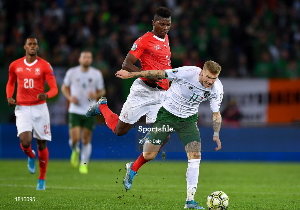 15 October 2019; James McClean of Republic of Ireland in action against Breel Embolo of Switzerland during the UEFA EURO2020 Qualifier match between Switzerland and Republic of Ireland at Stade de Genève in Geneva, Switzerland. Photo by Seb Daly/Sportsfile