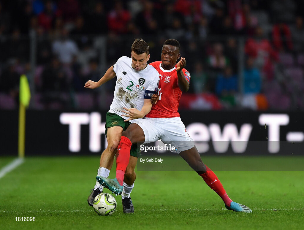 15 October 2019; Seamus Coleman of Republic of Ireland in action against Denis Zakaria of Switzerland during the UEFA EURO2020 Qualifier match between Switzerland and Republic of Ireland at Stade de Genève in Geneva, Switzerland. Photo by Seb Daly/Sportsfile