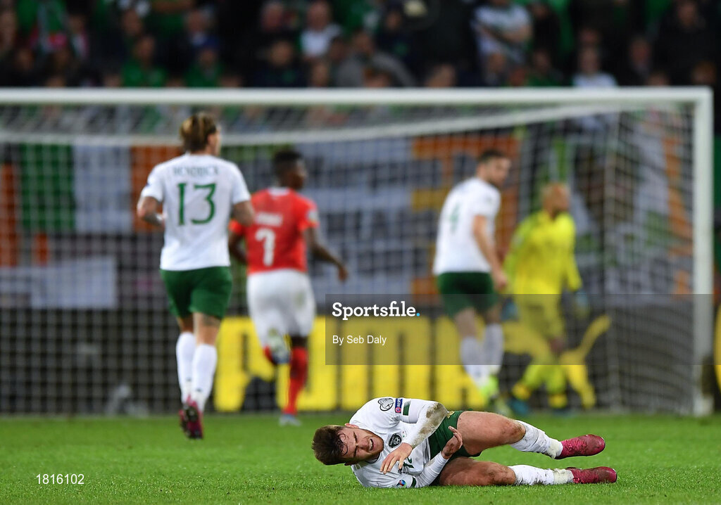 15 October 2019; Aaron Connolly of Republic of Ireland reacts following a collision during the UEFA EURO2020 Qualifier match between Switzerland and Republic of Ireland at Stade de Genève in Geneva, Switzerland. Photo by Seb Daly/Sportsfile