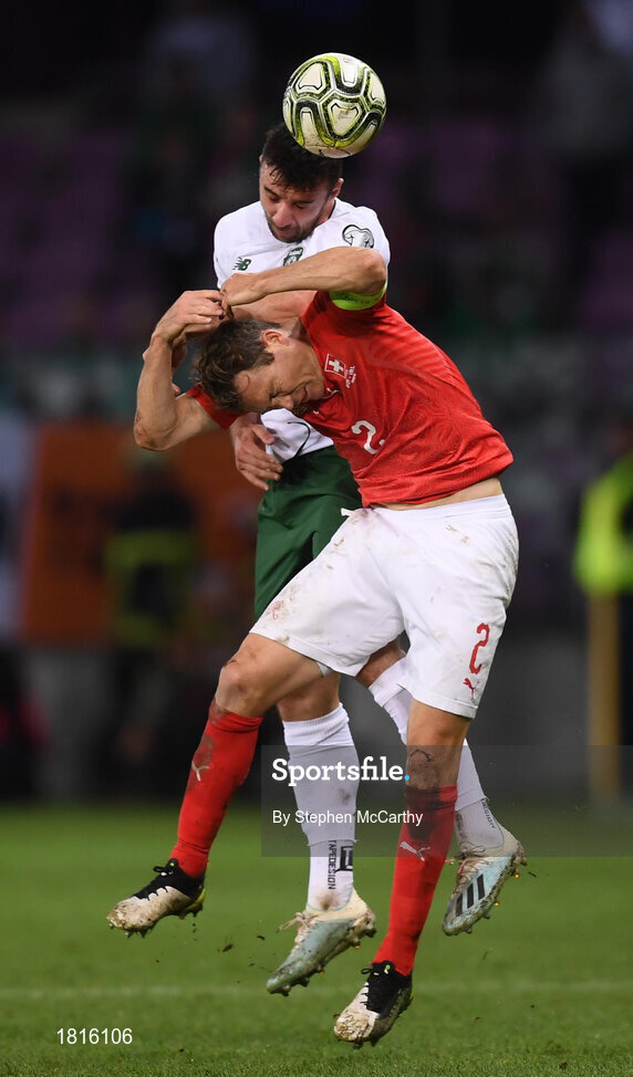 15 October 2019; Enda Stevens of Republic of Ireland in action against Stephan Lichtsteiner of Switzerland during the UEFA EURO2020 Qualifier match between Switzerland and Republic of Ireland at Stade de Genève in Geneva, Switzerland. Photo by Stephen McCarthy/Sportsfile