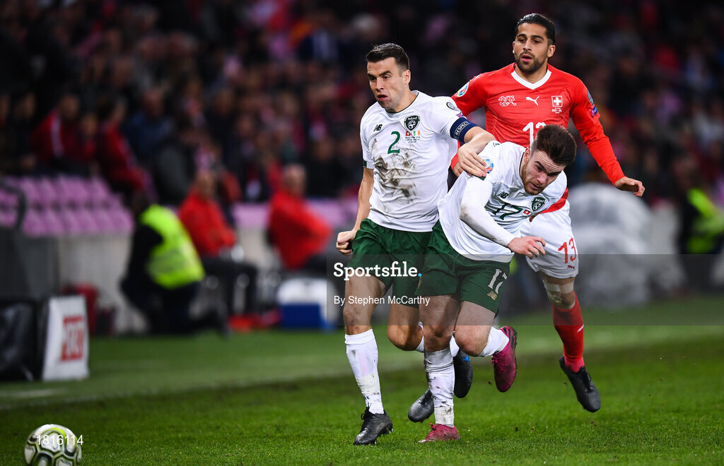 15 October 2019; Aaron Connolly, right, and Seamus Coleman of Republic of Ireland in action against Ricardo Rodríguez of Switzerland during the UEFA EURO2020 Qualifier match between Switzerland and Republic of Ireland at Stade de Genève in Geneva, Switzerland. Photo by Stephen McCarthy/Sportsfile