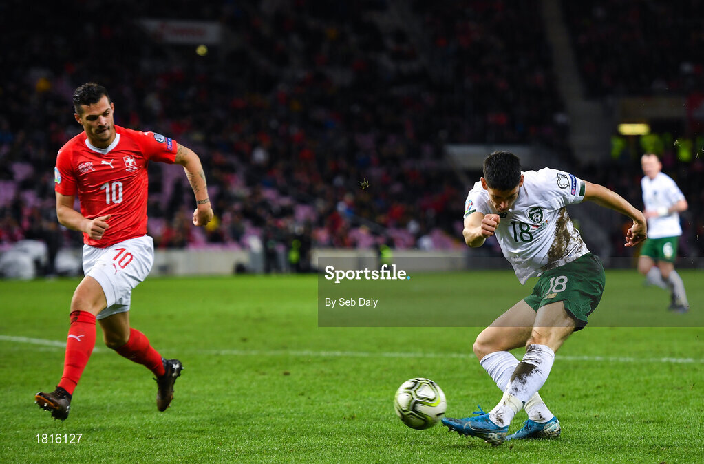 15 October 2019; Callum O'Dowda of Republic of Ireland in action against Granit Xhaka of Switzerland during the UEFA EURO2020 Qualifier match between Switzerland and Republic of Ireland at Stade de Genève in Geneva, Switzerland. Photo by Seb Daly/Sportsfile
