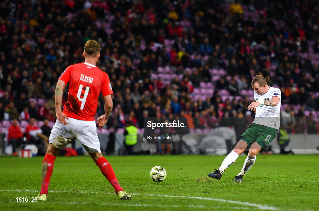 15 October 2019; Glenn Whelan of Republic of Ireland takes a shot during the UEFA EURO2020 Qualifier match between Switzerland and Republic of Ireland at Stade de Genève in Geneva, Switzerland. Photo by Seb Daly/Sportsfile
