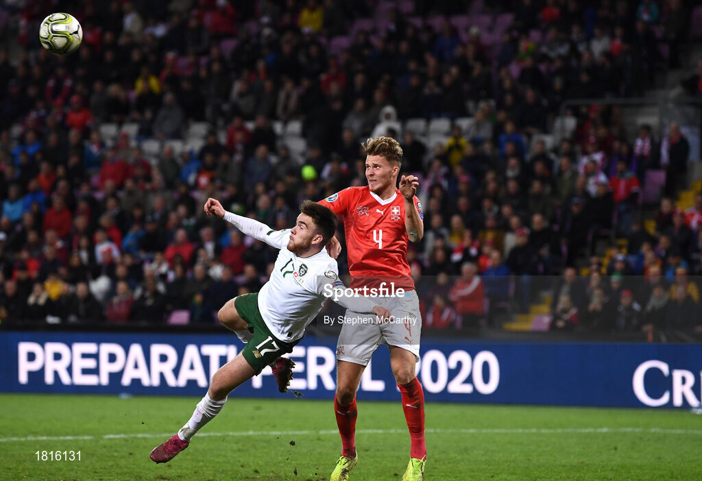 15 October 2019; Aaron Connolly of Republic of Ireland in action against Nico Elvedi of Switzerland during the UEFA EURO2020 Qualifier match between Switzerland and Republic of Ireland at Stade de Genève in Geneva, Switzerland. Photo by Stephen McCarthy/Sportsfile