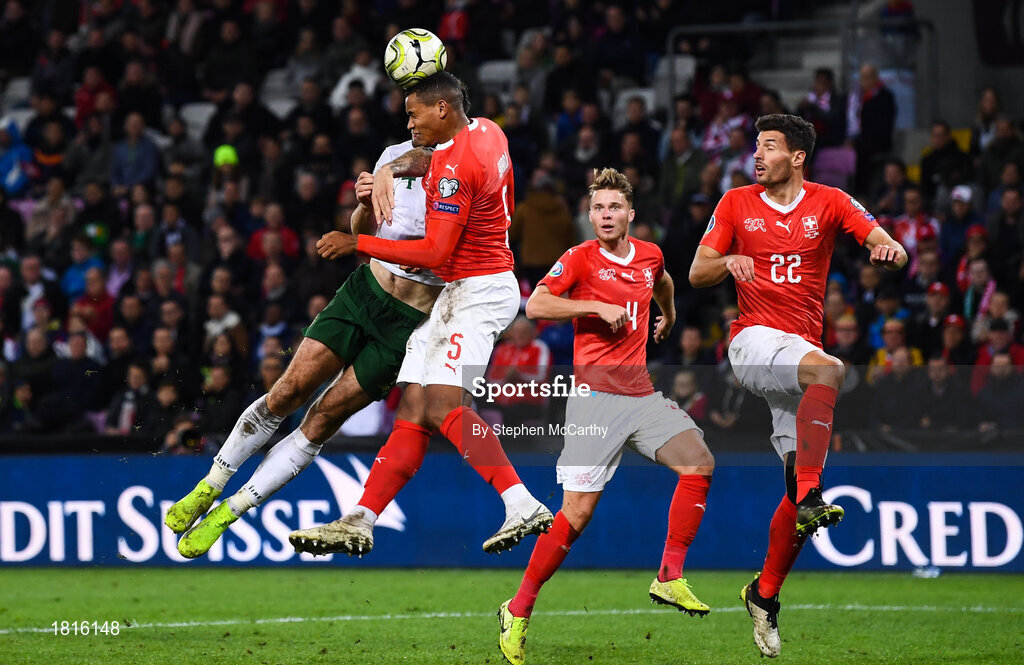 15 October 2019; Shane Duffy of Republic of Ireland fouls Manuel Akanji of Switzerland, resulting in a yellow card, during the UEFA EURO2020 Qualifier match between Switzerland and Republic of Ireland at Stade de Genève in Geneva, Switzerland. Photo by Stephen McCarthy/Sportsfile