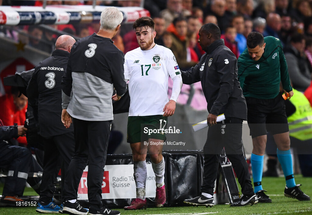 15 October 2019; Republic of Ireland manager Mick McCarthy shakes hands with Aaron Connolly after he was substituted in the second half during the UEFA EURO2020 Qualifier match between Switzerland and Republic of Ireland at Stade de Genève in Geneva, Switzerland. Photo by Stephen McCarthy/Sportsfile