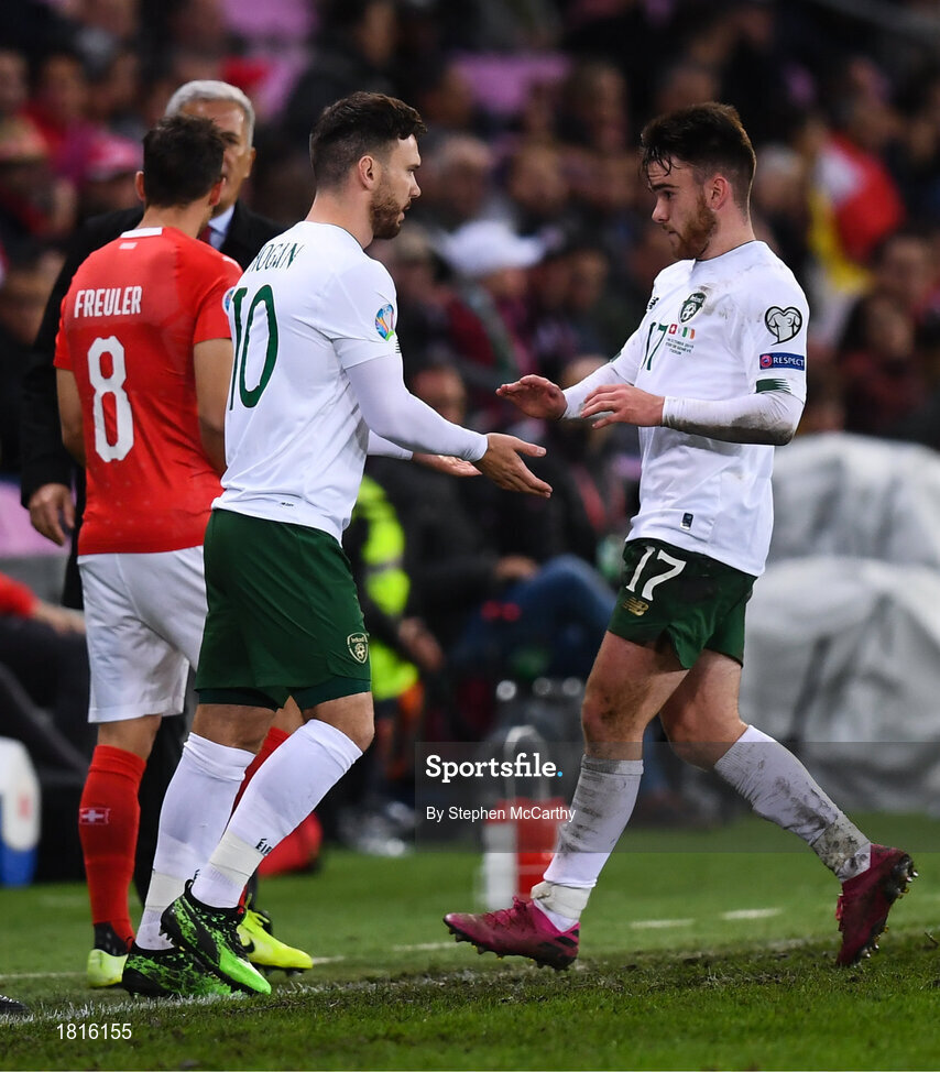 15 October 2019; Scott Hogan of Republic of Ireland with Aaron Connolly as he is substituted in the second half during the UEFA EURO2020 Qualifier match between Switzerland and Republic of Ireland at Stade de Genève in Geneva, Switzerland. Photo by Stephen McCarthy/Sportsfile