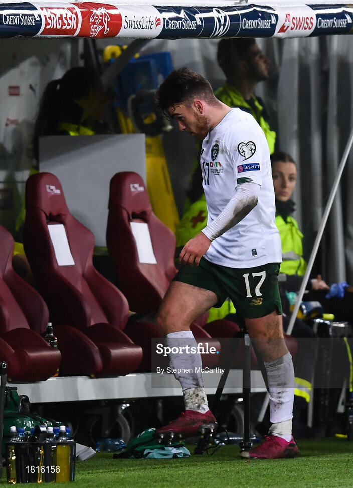 15 October 2019; Aaron Connolly of Republic of Ireland makes his way to the dugout after he is substituted in the second half during the UEFA EURO2020 Qualifier match between Switzerland and Republic of Ireland at Stade de Genève in Geneva, Switzerland. Photo by Stephen McCarthy/Sportsfile