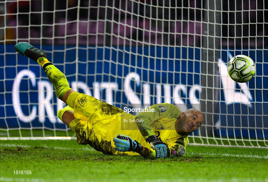 15 October 2019; Darren Randolph of Republic of Ireland saves a penalty from Ricardo Rodríguez of Switzerland during the UEFA EURO2020 Qualifier match between Switzerland and Republic of Ireland at Stade de Genève in Geneva, Switzerland. Photo by Seb Daly/Sportsfile