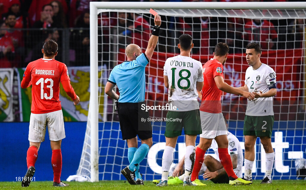 15 October 2019; Seamus Coleman, right, of Republic of Ireland receives a red card from referee Szymon Marciniak, resulting in a penalty for Switzerland, during the UEFA EURO2020 Qualifier match between Switzerland and Republic of Ireland at Stade de Genève in Geneva, Switzerland. Photo by Stephen McCarthy/Sportsfile