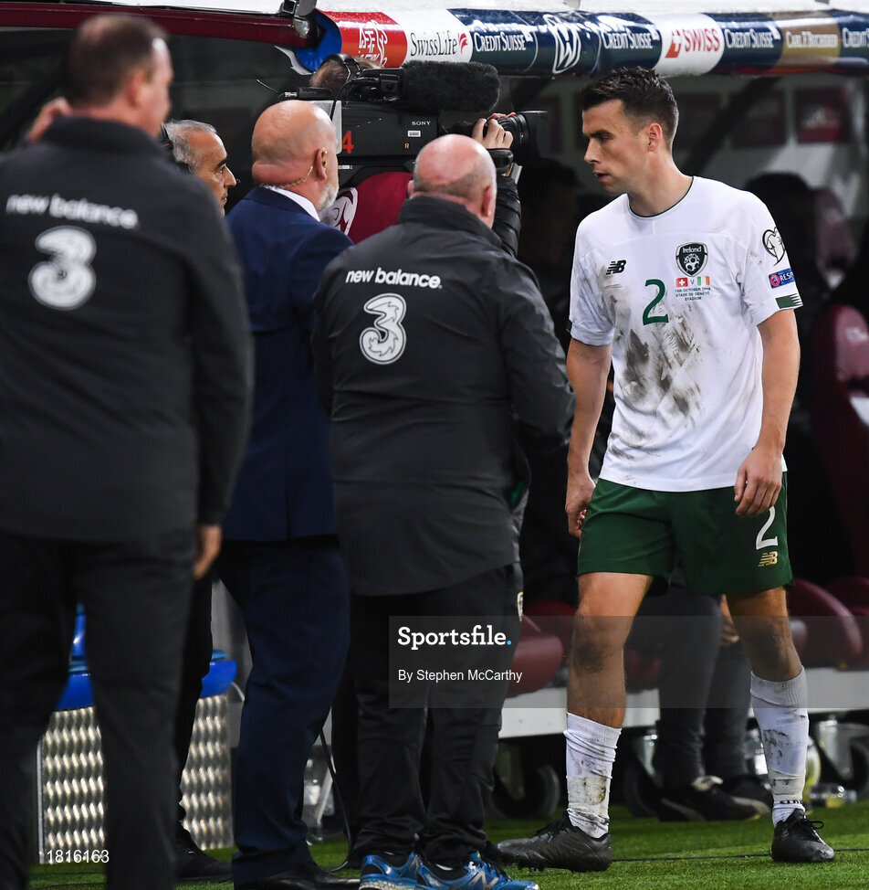 15 October 2019; Seamus Coleman of Republic of Ireland leaves the pitch after receiving a red card, resulting in a penalty for Switzerland, during the UEFA EURO2020 Qualifier match between Switzerland and Republic of Ireland at Stade de Genève in Geneva, Switzerland. Photo by Stephen McCarthy/Sportsfile