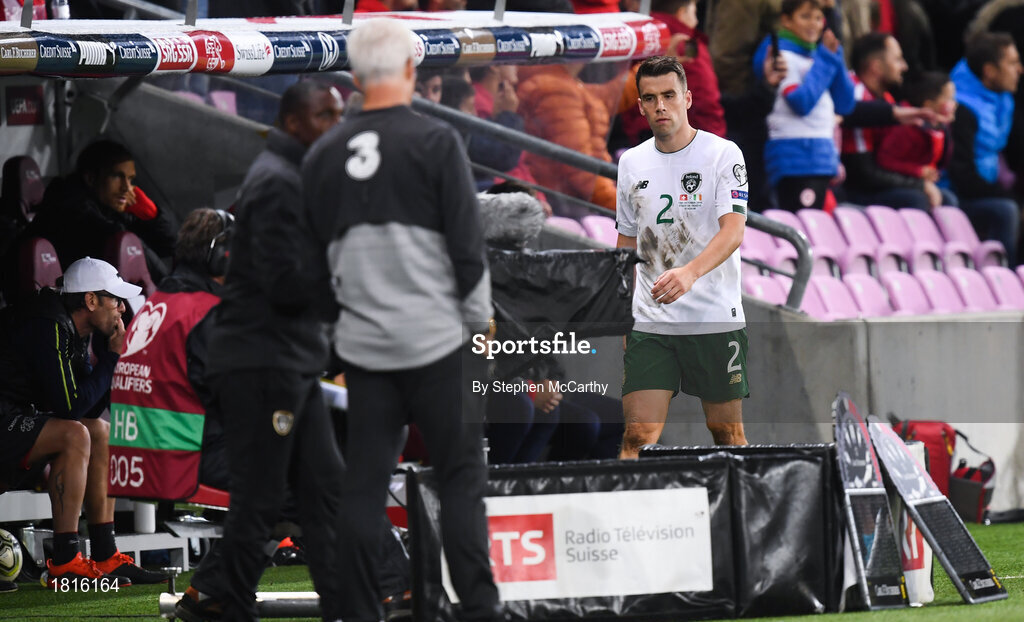 15 October 2019; Seamus Coleman of Republic of Ireland leaves the pitch after receiving a red card, resulting in a penalty for Switzerland, during the UEFA EURO2020 Qualifier match between Switzerland and Republic of Ireland at Stade de Genève in Geneva, Switzerland. Photo by Stephen McCarthy/Sportsfile