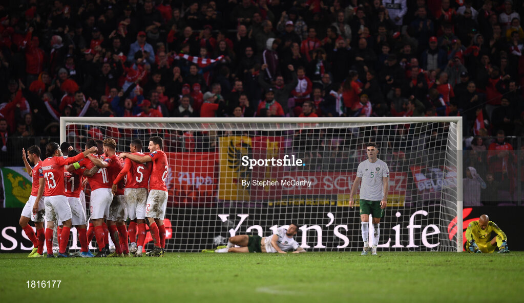 15 October 2019; John Egan of Republic of Ireland reacts after his side conceded their second goal during the UEFA EURO2020 Qualifier match between Switzerland and Republic of Ireland at Stade de Genève in Geneva, Switzerland. Photo by Stephen McCarthy/Sportsfile