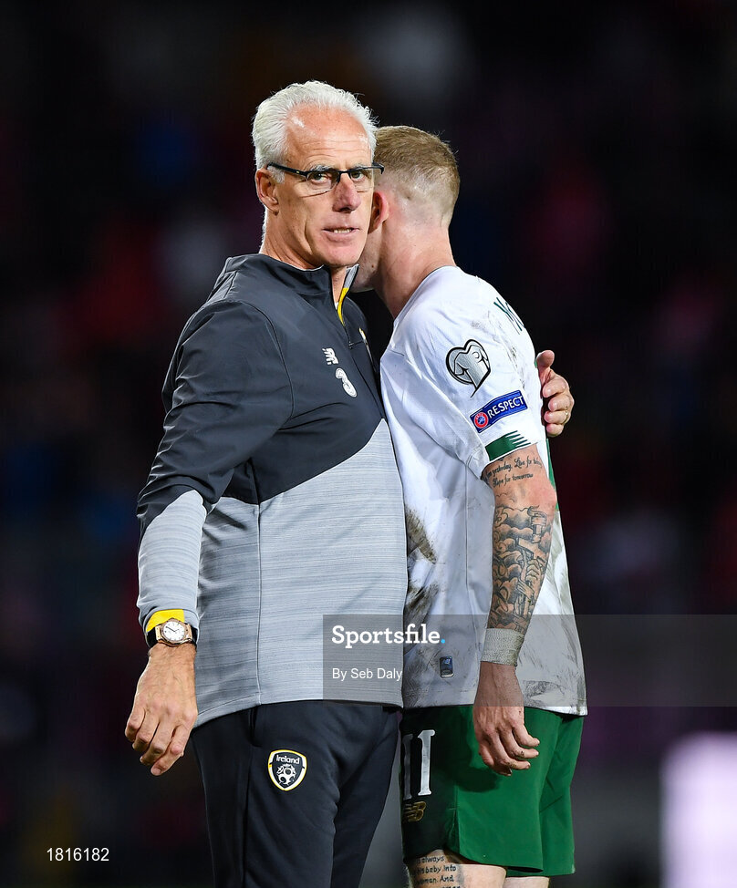 15 October 2019; Republic of Ireland manager Mick McCarthy and James McClean following the UEFA EURO2020 Qualifier match between Switzerland and Republic of Ireland at Stade de Genève in Geneva, Switzerland. Photo by Seb Daly/Sportsfile