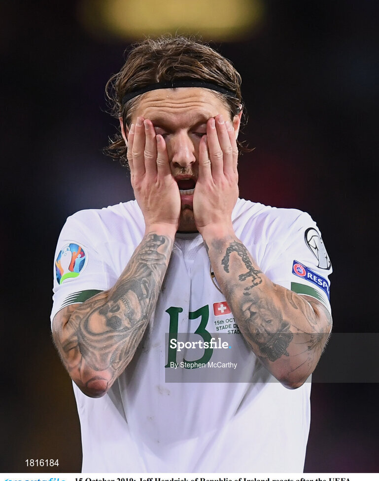 15 October 2019; Jeff Hendrick of Republic of Ireland reacts after the UEFA EURO2020 Qualifier match between Switzerland and Republic of Ireland at Stade de Genève in Geneva, Switzerland. Photo by Stephen McCarthy/Sportsfile