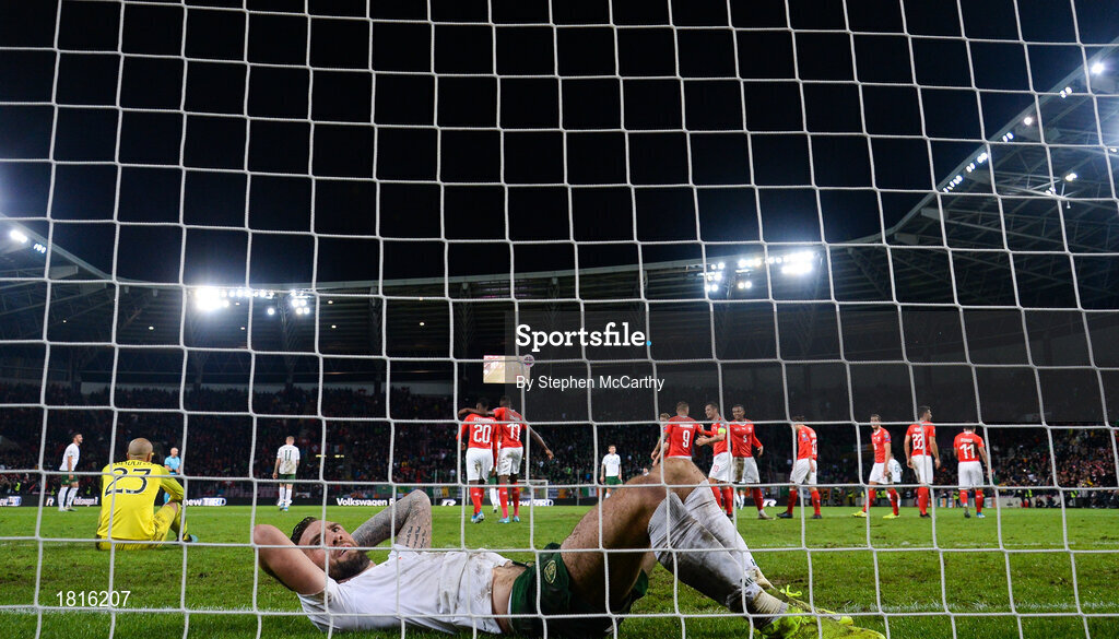 15 October 2019; Shane Duffy of Republic of Ireland reacts after conceding his side's second goal, an own goal, during the UEFA EURO2020 Qualifier match between Switzerland and Republic of Ireland at Stade de Genève in Geneva, Switzerland. Photo by Stephen McCarthy/Sportsfile