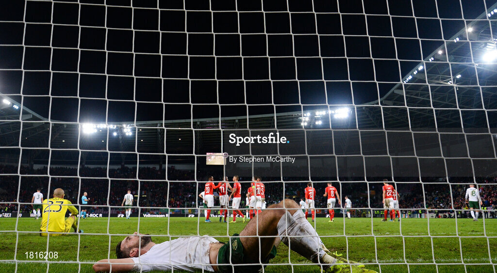 15 October 2019; Shane Duffy of Republic of Ireland reacts after conceding his side's second goal, an own goal, during the UEFA EURO2020 Qualifier match between Switzerland and Republic of Ireland at Stade de Genève in Geneva, Switzerland. Photo by Stephen McCarthy/Sportsfile