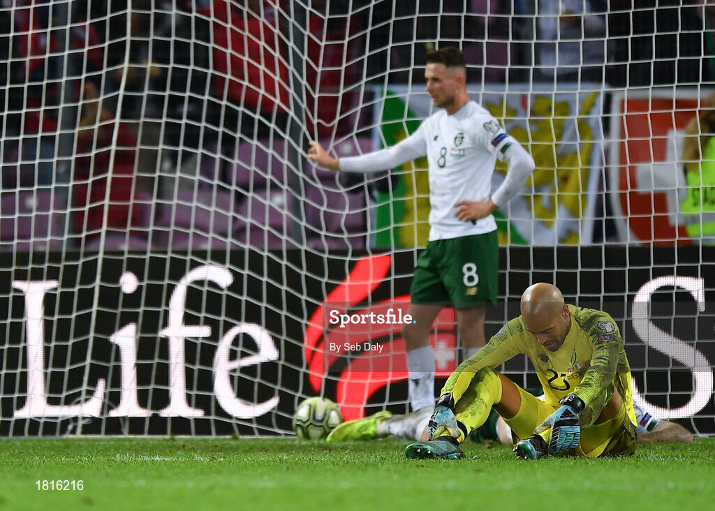 15 October 2019; Darren Randolph of Republic of Ireland reacts after his side conceded a second goal during the UEFA EURO2020 Qualifier match between Switzerland and Republic of Ireland at Stade de Genève in Geneva, Switzerland. Photo by Seb Daly/Sportsfile