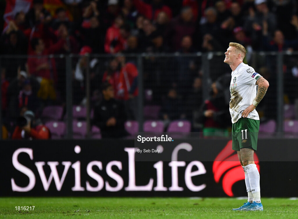 15 October 2019; James McClean of Republic of Ireland reacts after his side conceded a second goal during the UEFA EURO2020 Qualifier match between Switzerland and Republic of Ireland at Stade de Genève in Geneva, Switzerland. Photo by Seb Daly/Sportsfile