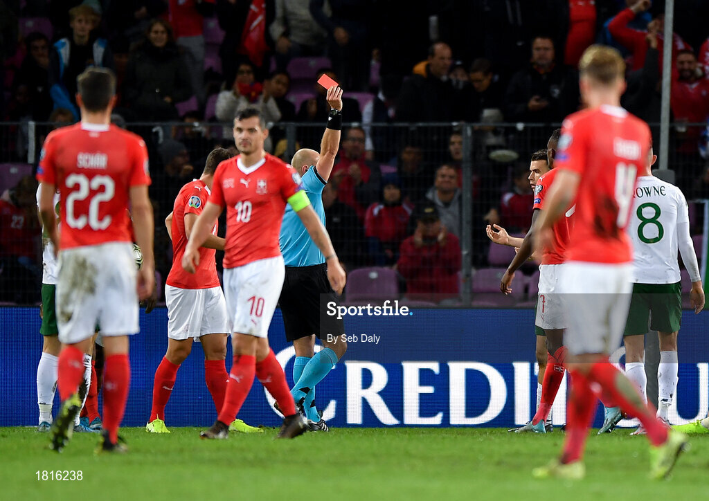 15 October 2019; Seamus Coleman of Republic of Ireland, right, is shown a red card by referee Szymon Marciniak during the UEFA EURO2020 Qualifier match between Switzerland and Republic of Ireland at Stade de Genève in Geneva, Switzerland. Photo by Seb Daly/Sportsfile
