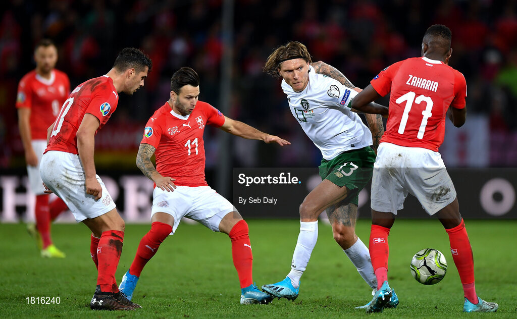 15 October 2019; Jeff Hendrick of Republic of Ireland in action against, from left, Granit Xhaka, Renato Steffen and Denis Zakaria of Switzerland during the UEFA EURO2020 Qualifier match between Switzerland and Republic of Ireland at Stade de Genève in Geneva, Switzerland. Photo by Seb Daly/Sportsfile
