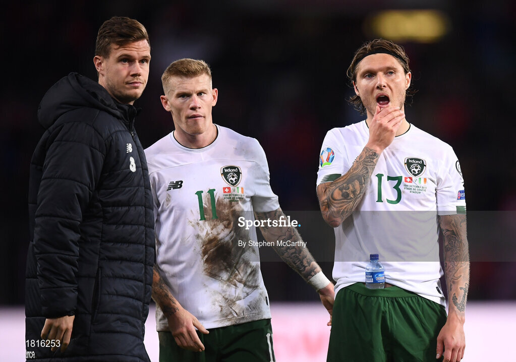 15 October 2019; James Collins, left, Jeff Hendrick, right, and James McClean of Republic of Ireland react after the UEFA EURO2020 Qualifier match between Switzerland and Republic of Ireland at Stade de Genève in Geneva, Switzerland. Photo by Stephen McCarthy/Sportsfile