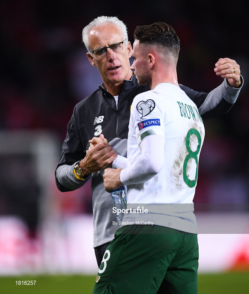 15 October 2019; Republic of Ireland manager Mick McCarthy with Alan Browne following the UEFA EURO2020 Qualifier match between Switzerland and Republic of Ireland at Stade de Genève in Geneva, Switzerland. Photo by Stephen McCarthy/Sportsfile