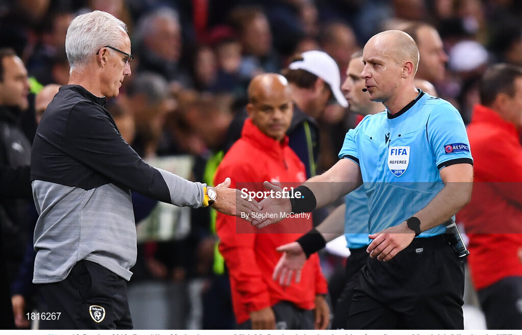 15 October 2019; Republic of Ireland manager Mick McCarthy shakes hands with referee Szymon Marciniak following the UEFA EURO2020 Qualifier match between Switzerland and Republic of Ireland at Stade de Genève in Geneva, Switzerland. Photo by Stephen McCarthy/Sportsfile