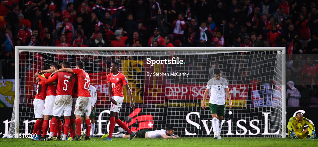 15 October 2019; John Egan of Republic of Ireland reacts after his side concede their second goal, an own goal scored by team-mate Shane Duffy, during the UEFA EURO2020 Qualifier match between Switzerland and Republic of Ireland at Stade de Genève in Geneva, Switzerland. Photo by Stephen McCarthy/Sportsfile