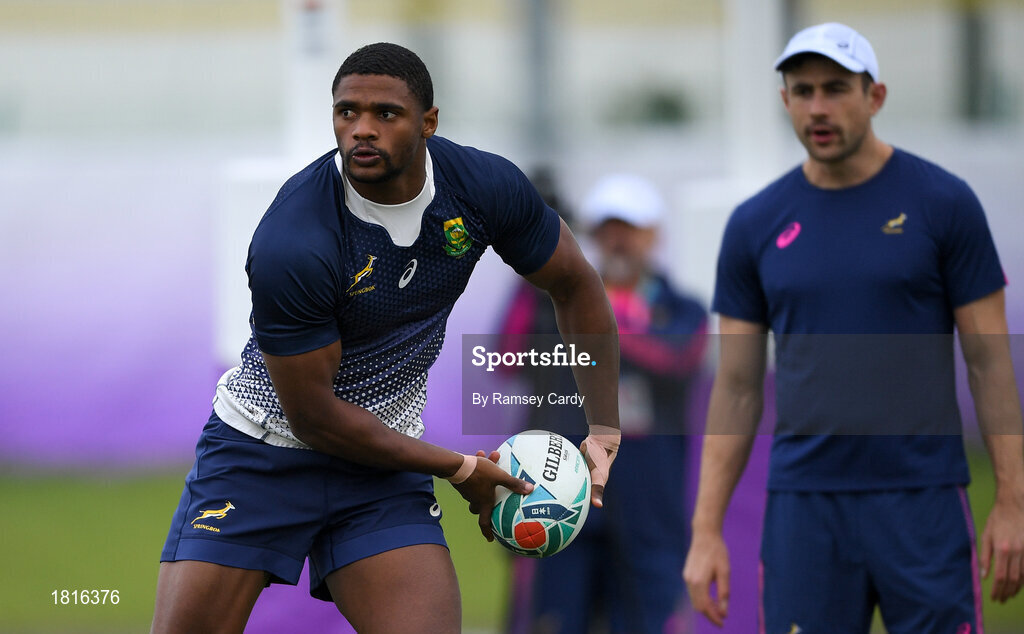 16 October 2019; Makazole Mapimpi, left, and defence consultant Felix Jones during South Africa squad training at Fuchu Asahi Football Park in Tokyo, Japan. Photo by Ramsey Cardy/Sportsfile