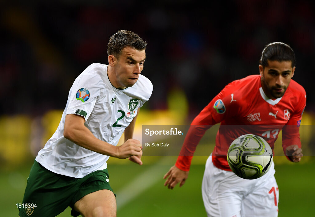 15 October 2019; Seamus Coleman of Republic of Ireland in action against Ricardo Rodríguez of Switzerland during the UEFA EURO2020 Qualifier match between Switzerland and Republic of Ireland at Stade de Genève in Geneva, Switzerland. Photo by Seb Daly/Sportsfile