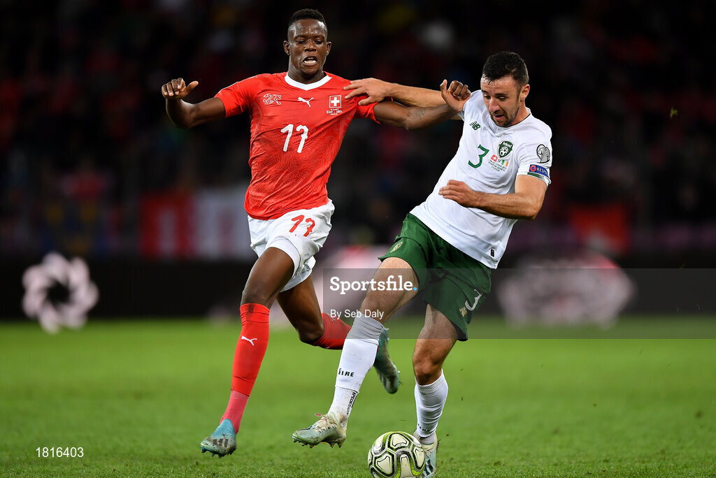 15 October 2019; Enda Stevens of Republic of Ireland in action against Denis Zakaria of Switzerland during the UEFA EURO2020 Qualifier match between Switzerland and Republic of Ireland at Stade de Genève in Geneva, Switzerland. Photo by Seb Daly/Sportsfile