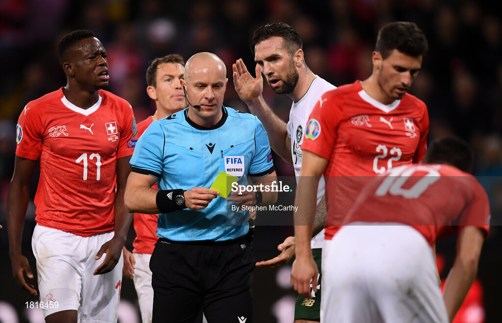 15 October 2019; Referee Szymon Marciniak issues Shane Duffy of Republic of Ireland with a yellow card during the UEFA EURO2020 Qualifier match between Switzerland and Republic of Ireland at Stade de Genève in Geneva, Switzerland. Photo by Stephen McCarthy/Sportsfile