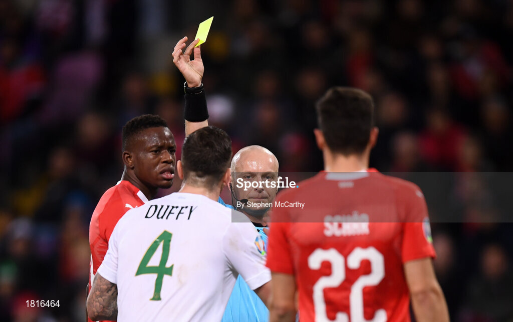 15 October 2019; Referee Szymon Marciniak issues Shane Duffy of Republic of Ireland with a yellow card during the UEFA EURO2020 Qualifier match between Switzerland and Republic of Ireland at Stade de Genève in Geneva, Switzerland. Photo by Stephen McCarthy/Sportsfile