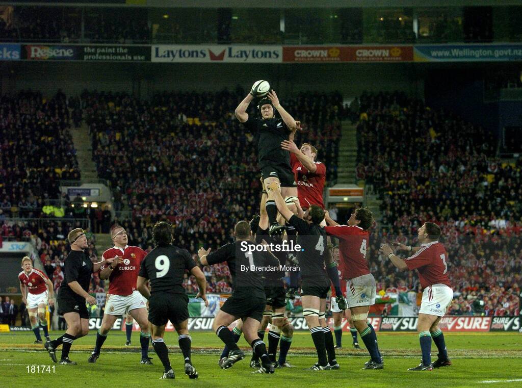 2 July 2005; Ali Williams, New Zealand, wins a lineout from Paul O'Connell, British and Irish Lions. British and Irish Lions Tour to New Zealand 2005, 2nd Test, New Zealand v British and Irish Lions, Westpac Stadium, Wellington, New Zealand. Picture credit; Brendan Moran / SPORTSFILE