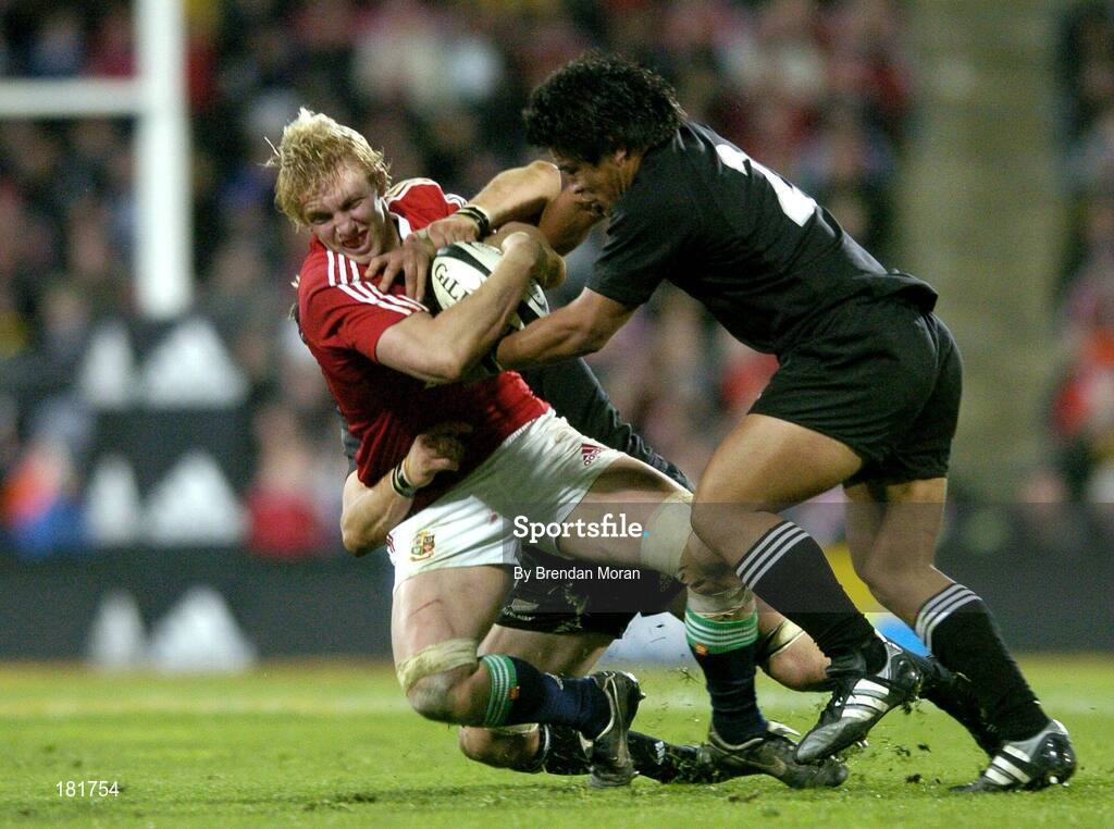 2 July 2005; Lewis Moody, British and Irish Lions, is tackled by Keven Mealamu, left, and Ali Williams, New Zealand. British and Irish Lions Tour to New Zealand 2005, 2nd Test, New Zealand v British and Irish Lions, Westpac Stadium, Wellington, New Zealand. Picture credit; Brendan Moran / SPORTSFILE
