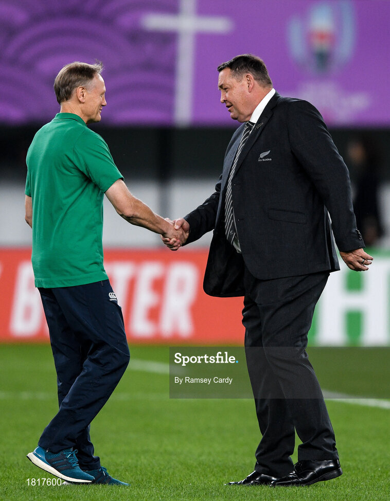 19 October 2019; Ireland head coach Joe Schmidt, left, with New Zealand head coach Steve Hansen before the 2019 Rugby World Cup Quarter-Final match between New Zealand and Ireland at the Tokyo Stadium in Chofu, Japan. Photo by Ramsey Cardy/Sportsfile