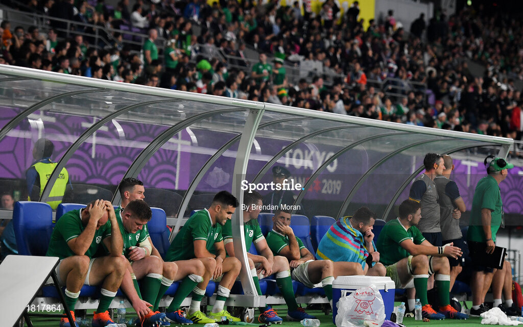 19 October 2019; A dejected Irish bench look on during the final moments of the 2019 Rugby World Cup Quarter-Final match between New Zealand and Ireland at the Tokyo Stadium in Chofu, Japan. Photo by Brendan Moran/Sportsfile